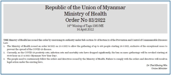 미얀마 보건부는 2022년 4월 17일부터 코로나19 예방 및 통제법 21조(b)항에 의거하여