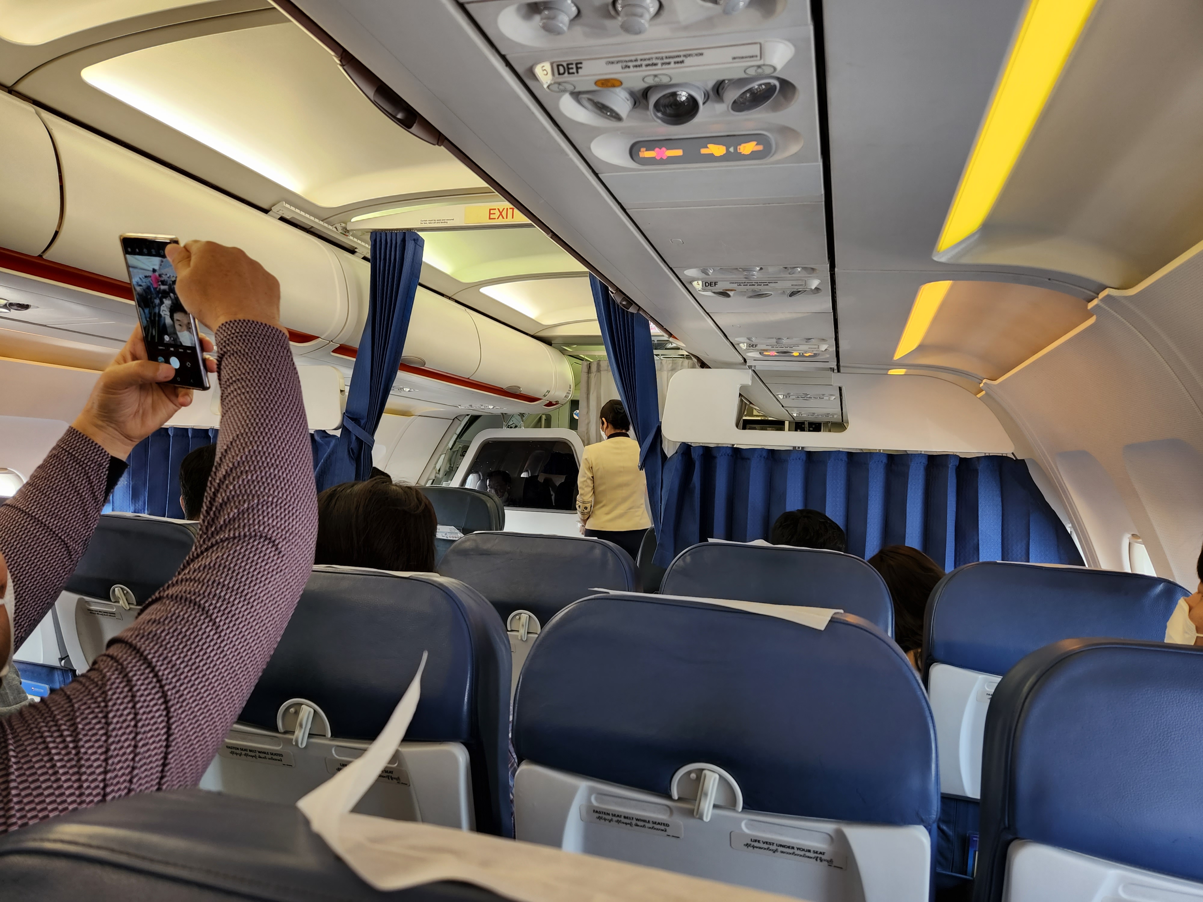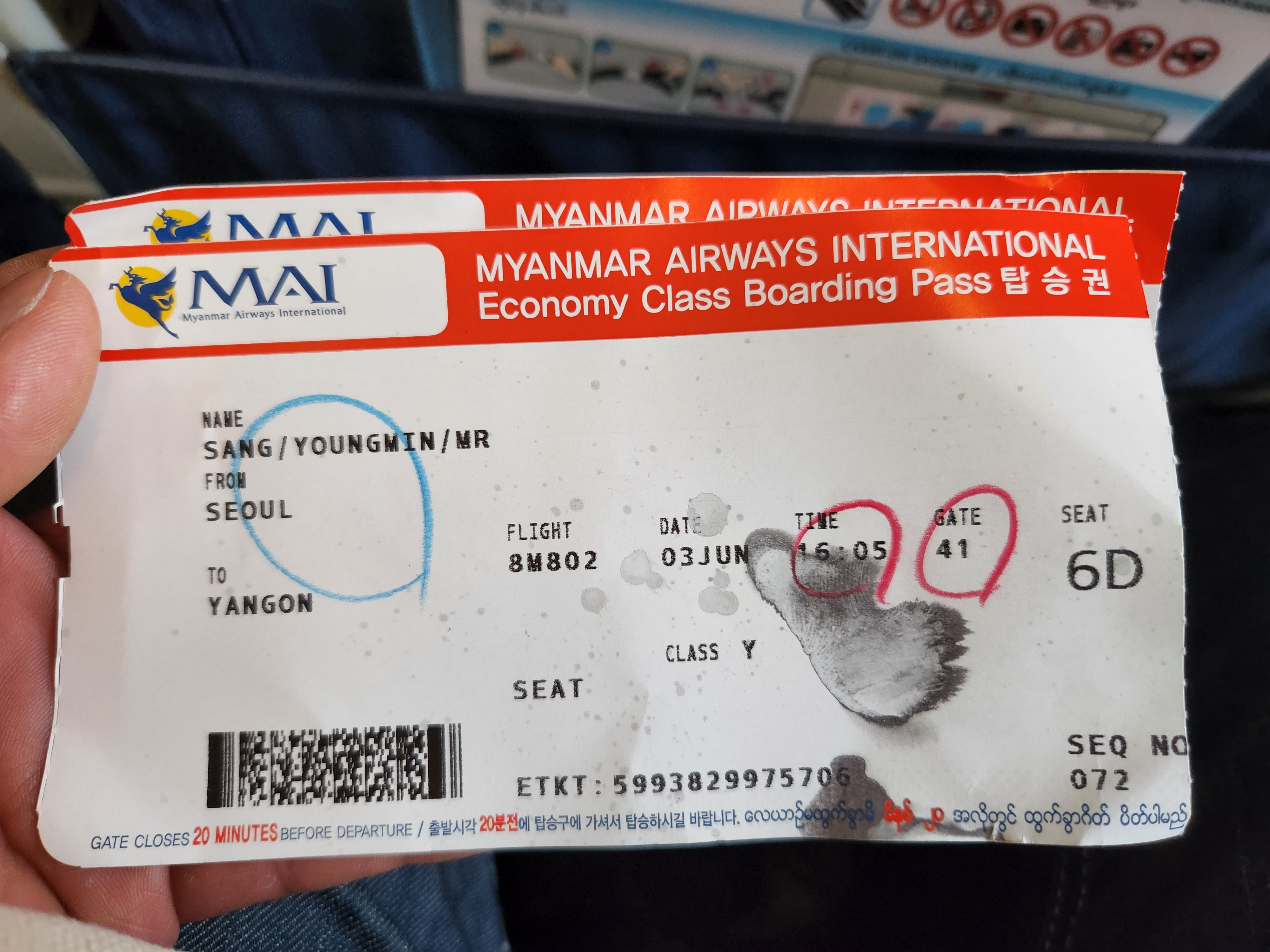 미얀마 항공은 좌석수가 적다보니 화장실은 1개뿐이였다. 6시간 30분이라는 비행동안 참고 참는 아내에게 미안하기도 했다.