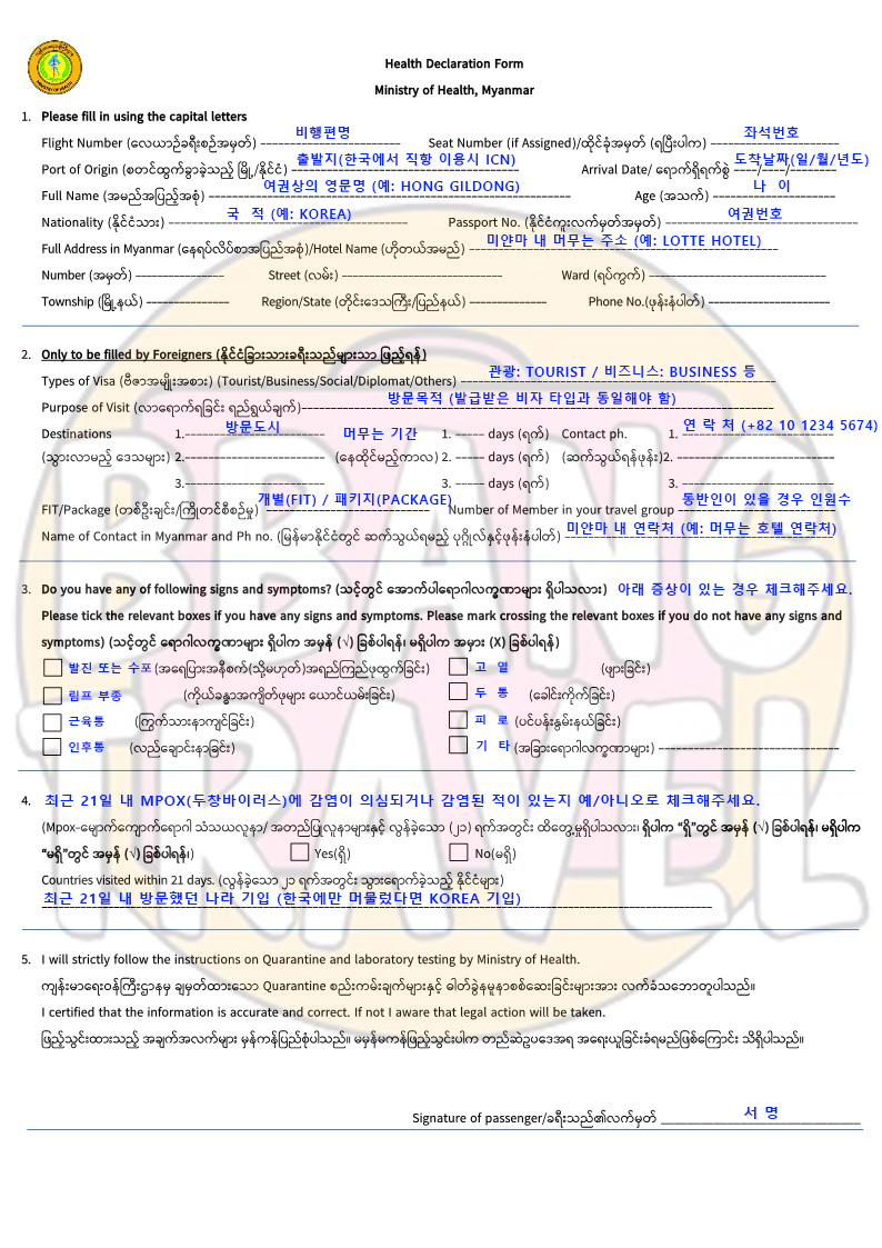 미얀마에 도착하는 모든 여행객은 비행기에서 건강신고서(Health Declaration Card, HDC)를 작성해야 하며