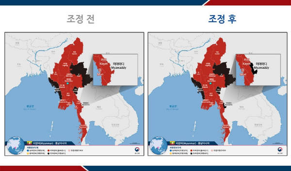 ■ 우리 정부는 우리국민 보호를 위해 최근 불법 취업사기 및 감금 피해 상황이 지속 발생하고 있는 미얀마 카인(Kayin)州 미야와디 전체 지역에 대해 12.27.(금) 00시(미얀마 현지시간 12.26.(목) 21:30)부터 여행경보 4단계(여행금지)를 발령하기로 결정하였습니다.