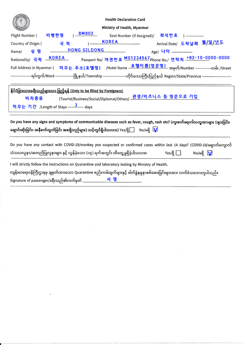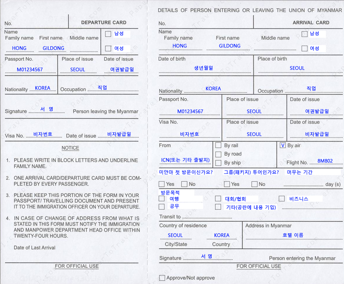 2024년 미얀마 입국 서류 작성 참고 빵트래블