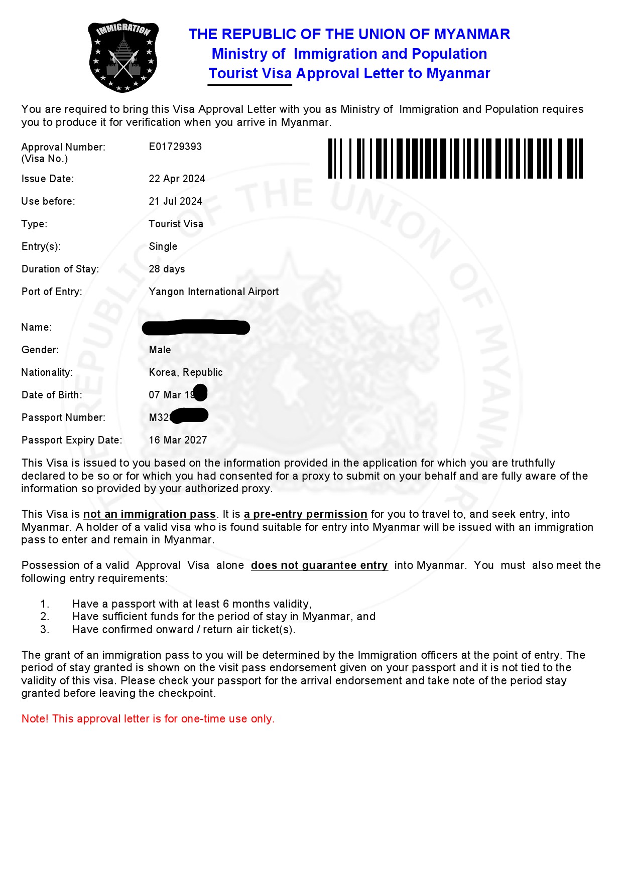 미얀마 비자 (e-visa)발급 증서 빵트래블