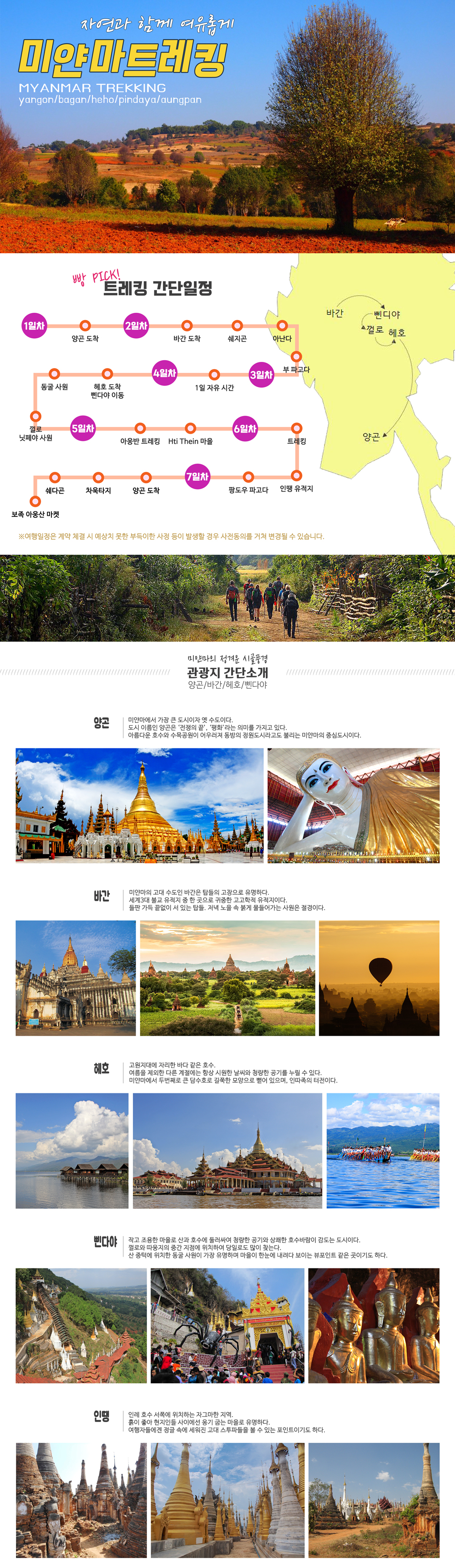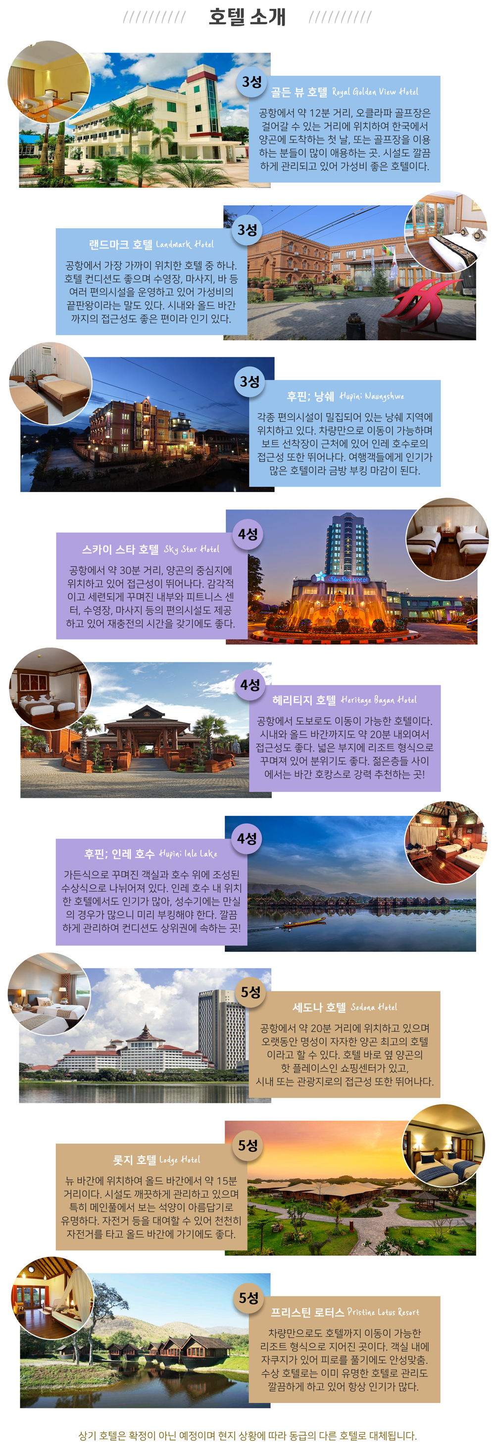 -미얀마는 아직 호텔시설이 미비한 편입니다. 따라서 현지사정상 부득이한 경우 다른 동급의 호텔로 변동될 수 있으며, 연박이 어려울 수 있습니다.