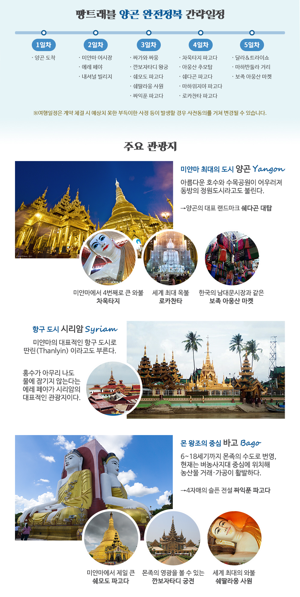 인천 공항에서 미팅을 시작으로 5박6일 양곤 투어 후 인천공항까지 이용하실 수 있는 편리한 상품입니다.