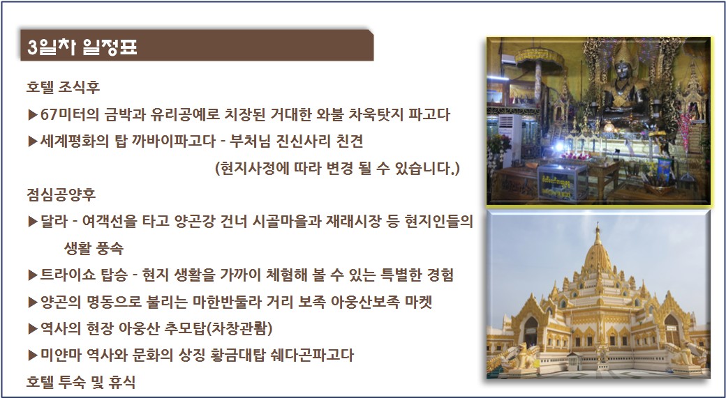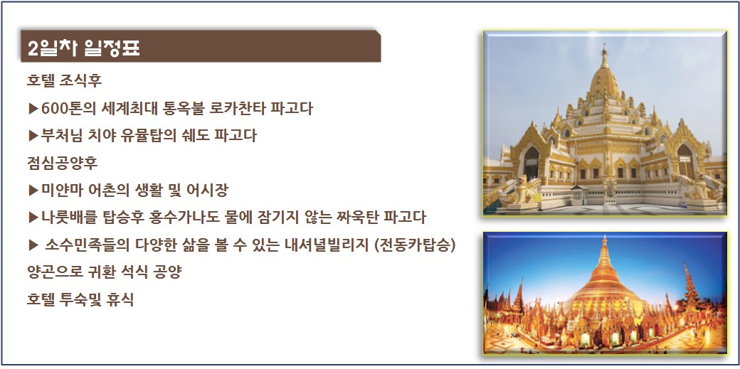• 포함사항 5성호텔 2인1실, 미얀마비자, 전용차량, 가이드, 기사팁, 중-석식, 일정표상의 입장료, 차량내 생수