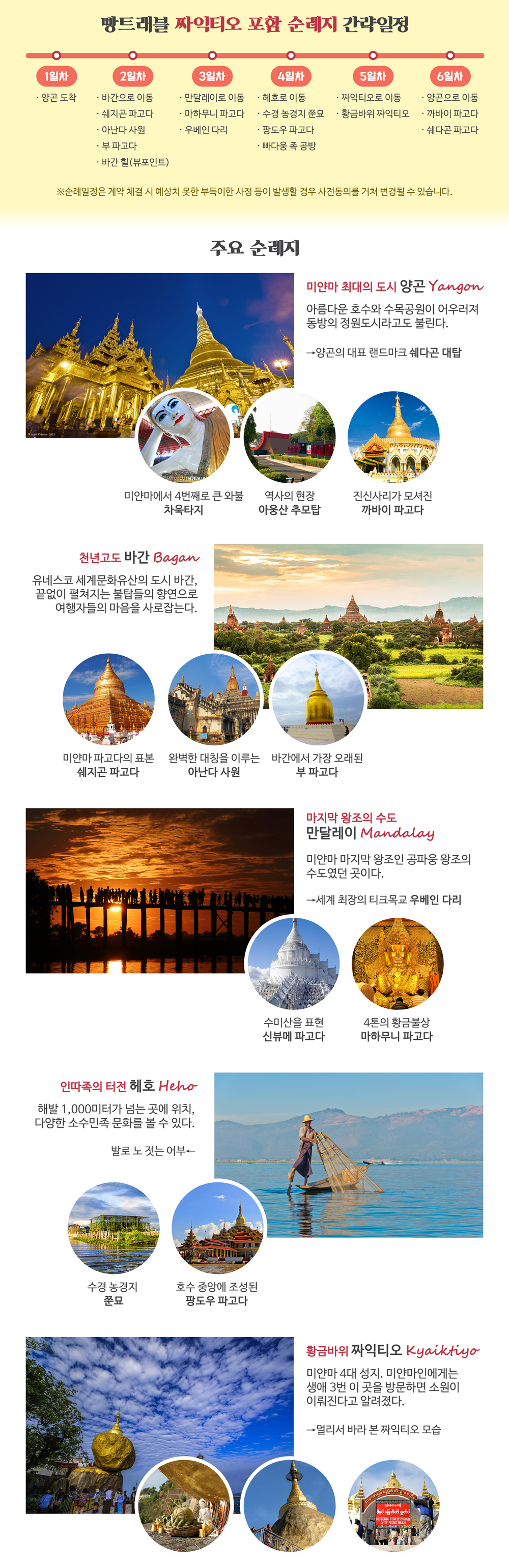 양곤 호텔(1N)+바간 호텔(1N)+만달레이 호텔(1N)+헤호 호텔(1N)+짜익티오 호텔(1N)☞2인1실 기준