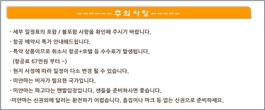 -미얀마는 아직 호텔시설이 미비한 편입니다. 따라서 현지사정상 부득이한 경우 다른 동급의 호텔로 변동될 수 있으며, 연박이 어려울 수 있습니다.