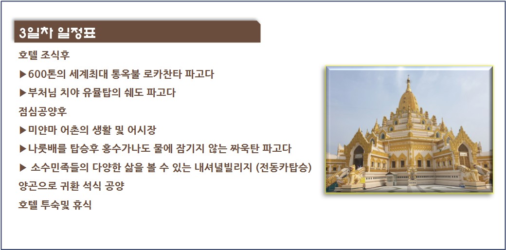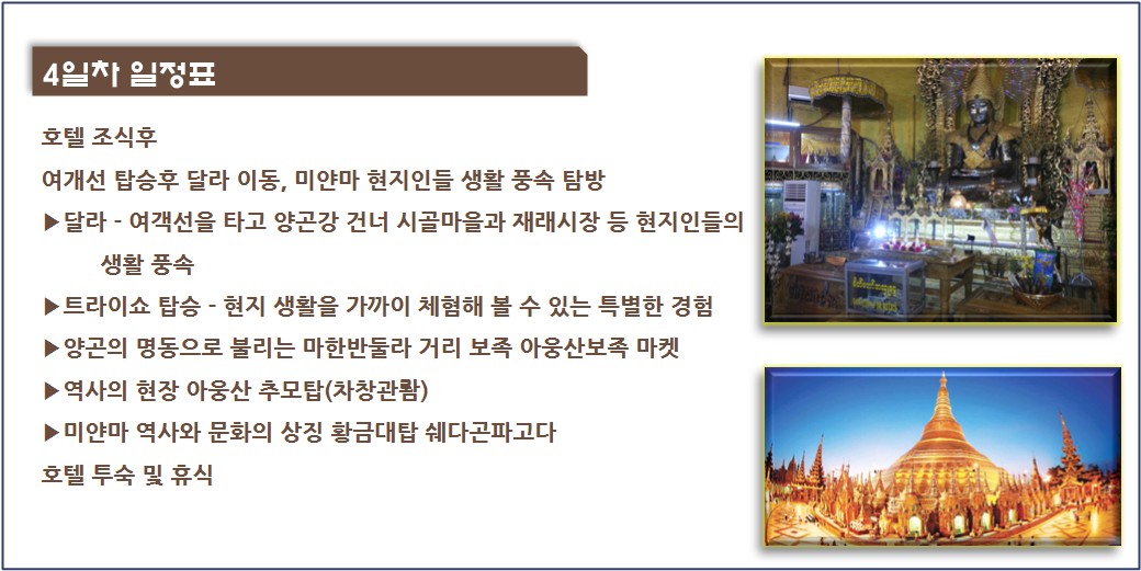 현지 4박5일 양곤 순례 일정으로 편리한 상품입니다.