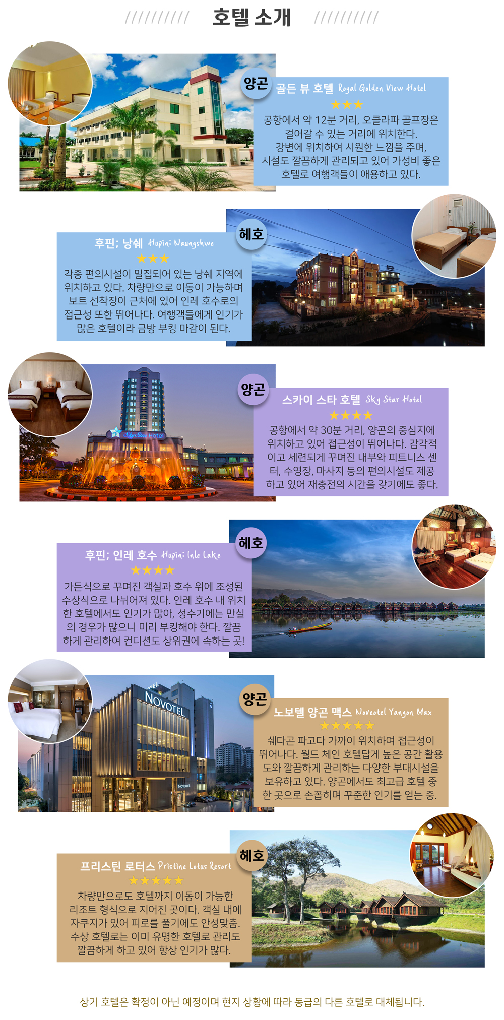 -미얀마는 아직 호텔시설이 미비한 편입니다. 따라서 현지사정상 부득이한 경우 다른 동급의 호텔로 변동될 수 있으며, 연박이 어려울 수 있습니다.