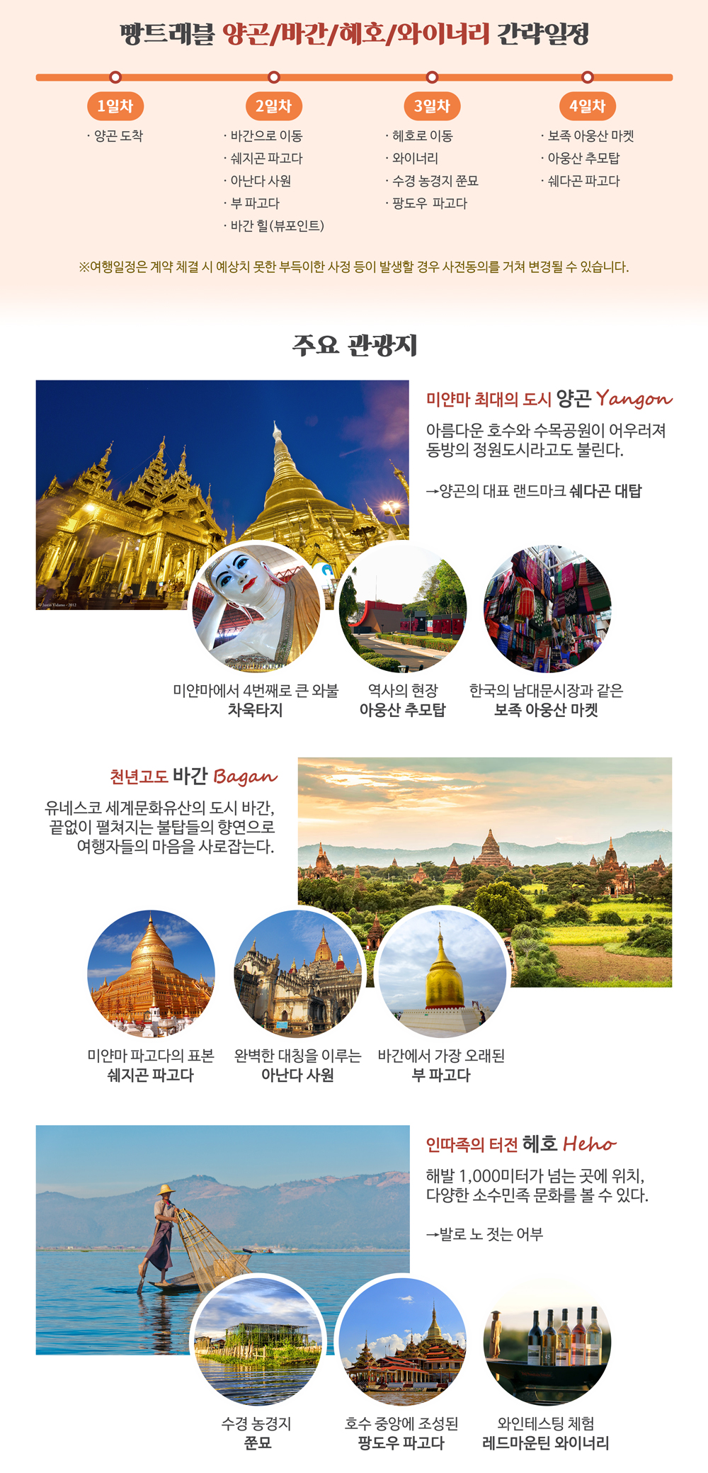 시간에 쫓기지 않게 여유로운 일정으로 더욱 풍성하고 특별한 미얀마를 만나보세요~