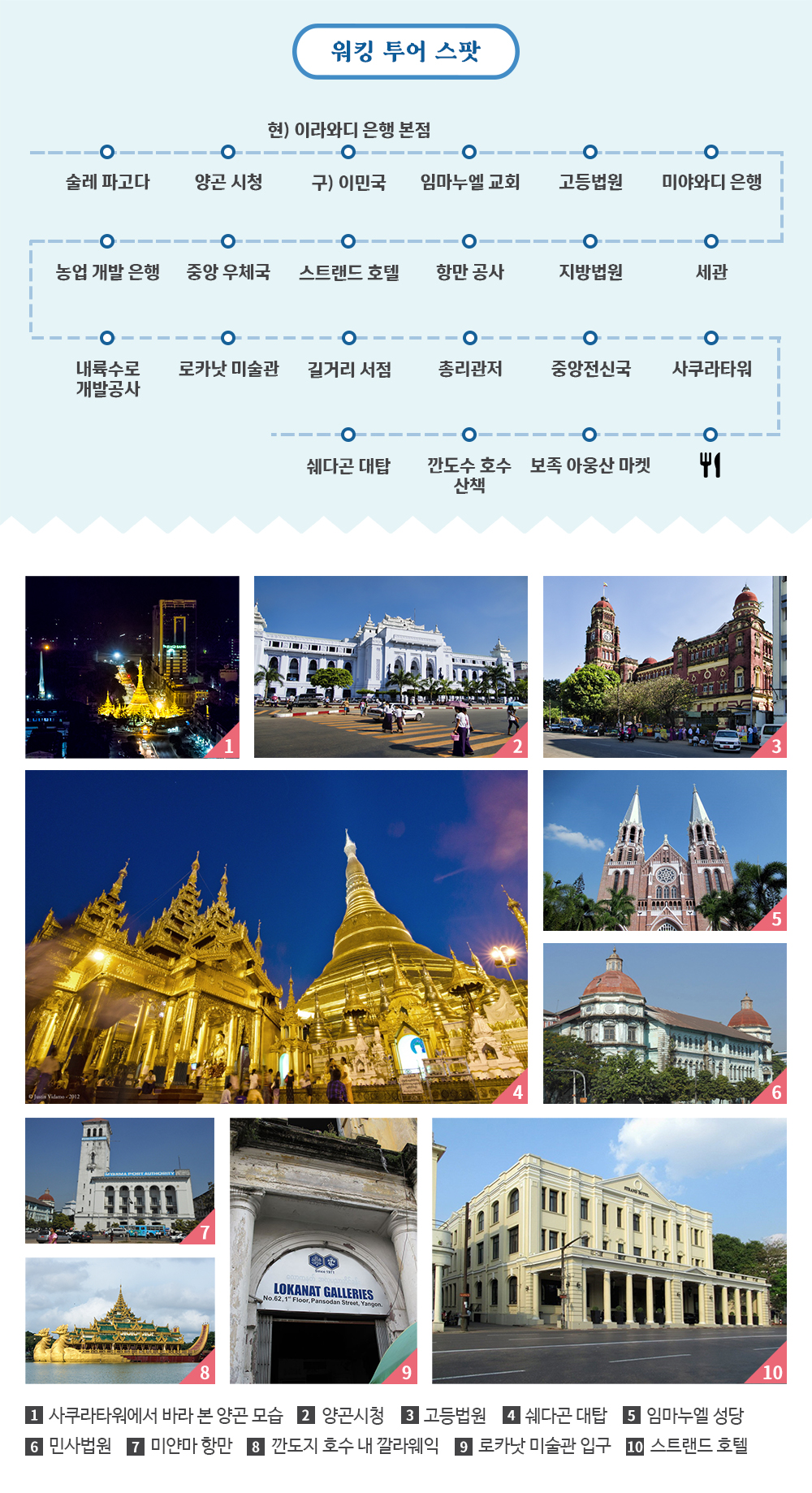 -술레 파고다/임마누엘 교회/고등법원/항만공사/스트랜드 호텔/로카낫 미술관/사쿠라타워 등