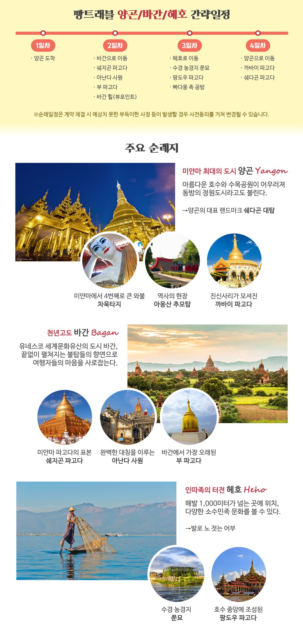 -미얀마는 아직 호텔시설이 미비한 편입니다. 따라서 현지사정상 부득이한 경우 다른 동급의 호텔로 변동될 수 있으며, 연박이 어려울 수 있습니다.