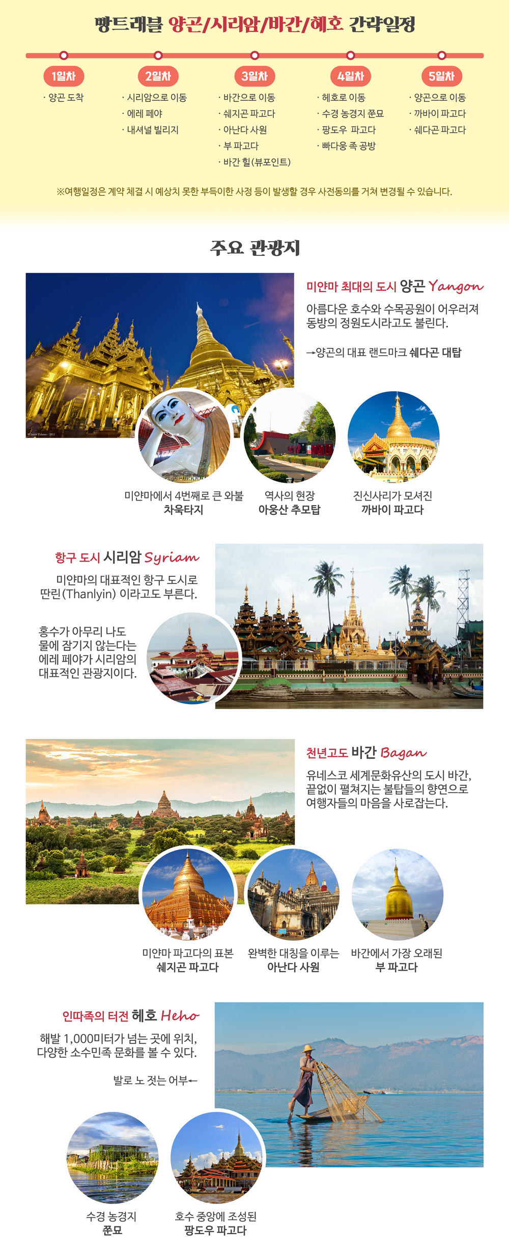 -미얀마는 아직 호텔시설이 미비한 편입니다. 따라서 현지사정상 부득이한 경우 다른 동급의 호텔로 변동될 수 있으며, 연박이 어려울 수 있습니다.