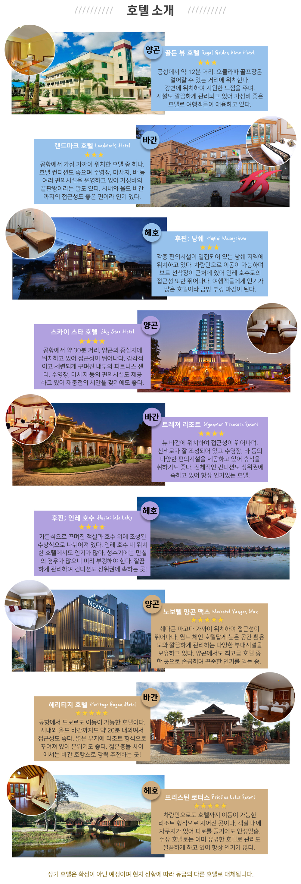 -미얀마는 아직 호텔시설이 미비한 편입니다. 따라서 현지사정상 부득이한 경우 다른 동급의 호텔로 변동될 수 있으며, 연박이 어려울 수 있습니다.