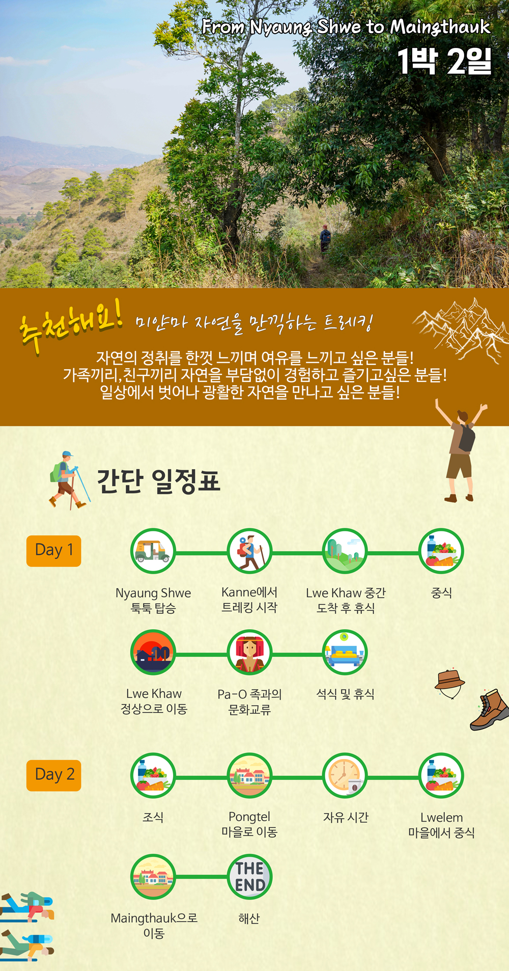 헤호 지역의 핵심 도시인 Nyaung Shwe에서 출발하여 Lwe Khaw를 거쳐 Maingthauk까지 이동하는 1박2일 코스입니다.