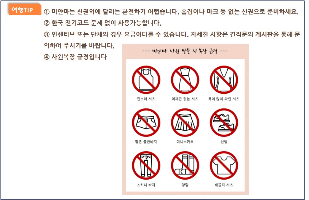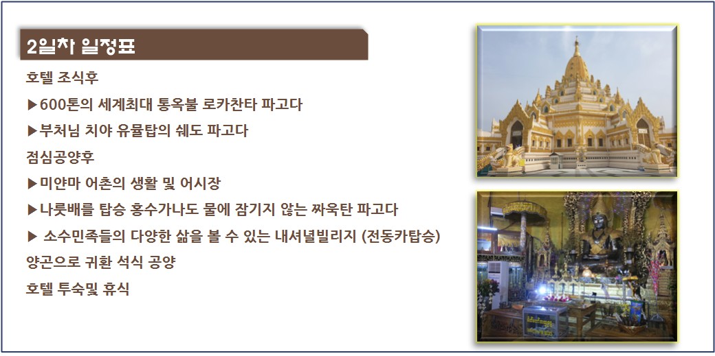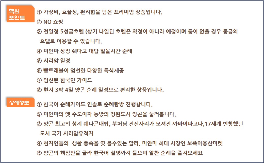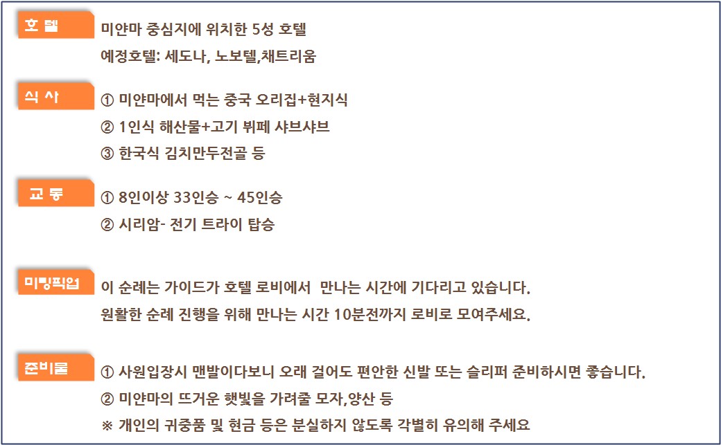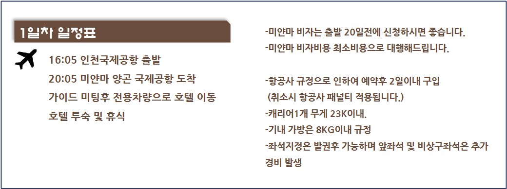• 포함사항 국제선, 미얀마비자, 5성호텔 2인1실, 한국어가이드+로컬, 전용차량, 전일정 식사, 일정표상의 입장료, 차량내 생수